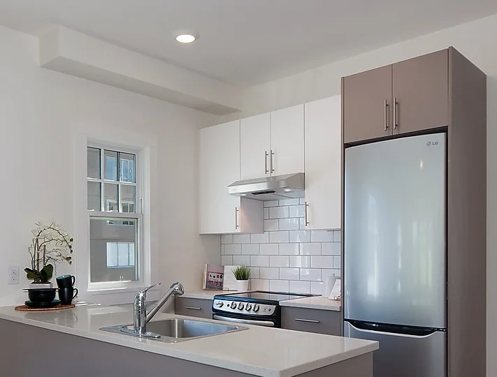 • Full-size, European-style fridge, stove & dishwasher